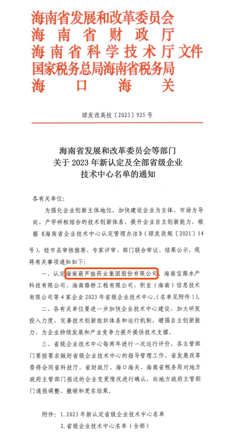 近日,海南省发改委等多部门联合公布了《关于2023年新认定及全部省级企业技术中心名单的通知》,其中,海南银娱优越会药业集团股份有限公司成功通过评审,被认定为省级企业技术中心,是本次获批的4家企业之一。